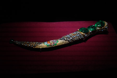 Istanbul, Turkey - June 18 2022: The Topkapi Dagger is an emerald-studded curved dagger. It is decorated with many small diamonds.