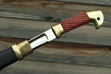 hilt and part of the sword blade, half pushed out of the sheath, close-up against a blurred wooden wall