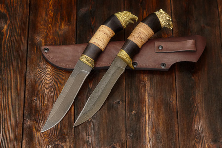 Hunting damascus steel knives handmade and leather sheath on a brown wooden background, closeup