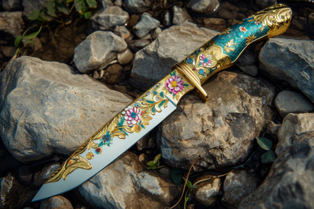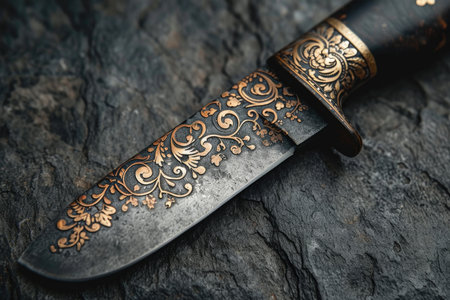 Discover the beauty of an ornate knife featuring an intricately designed blade and handle. The exquisite craftsmanship showcases stunning details and elegant patterns.