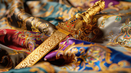 A stunning golden sword elegantly rests on a silk fabric, showcasing intricate patterns and vibrant colors. This artwork captures luxury and craftsmanship.