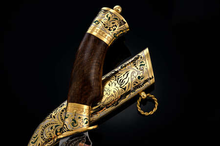 souvenir collectible silver gold dagger cutlass with scabbard, with metal engraving, on black background. Luxury weapons with traditional patterns in medieval vintage style.