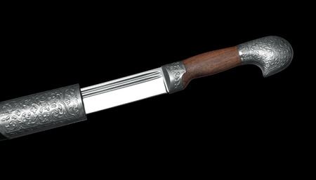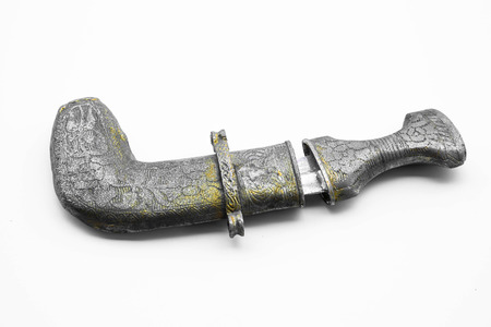 A traditional knife, or khanjar, of the kind worn with national dress in southern Arabia, especially Oman, symbolising readiness to defend one's honour. Monochrome.