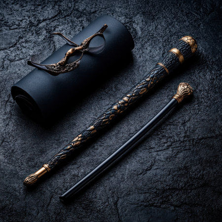 A black and gold sword is displayed next to a black and gold staff. The sword is long and has a gold handle. The scene is set on a dark surface