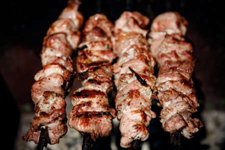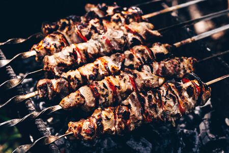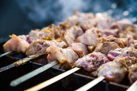 BBQ barbecuing skewers pork kebab, close up image. High quality photo.