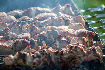Meat close-up on the grill. Hot meat on charcoal on a sunny afternoon in the park. Summer holidays with friends. Background blur. Best pastime in the summer.