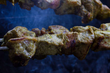 Cooking marinated pork skewers on the grill. Juicy pieces of meat in the marinade are covered with smoke from the fire. Fried pork kebab on an open fire. Grill cooking season.
