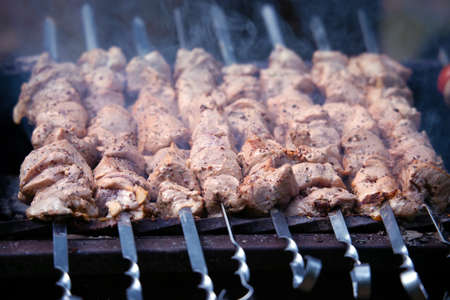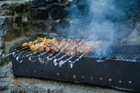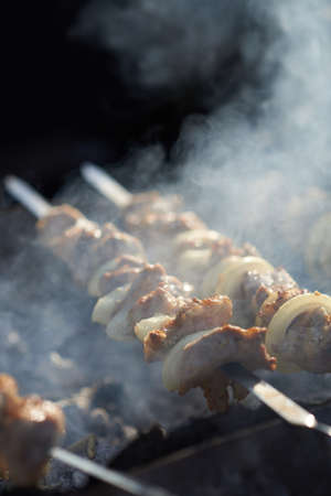 Marinated shashlik preparing on a barbecue grill over charcoal with smoke. High quality photo
