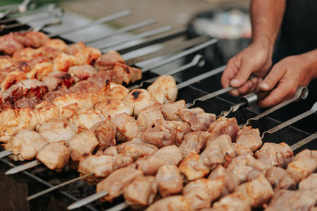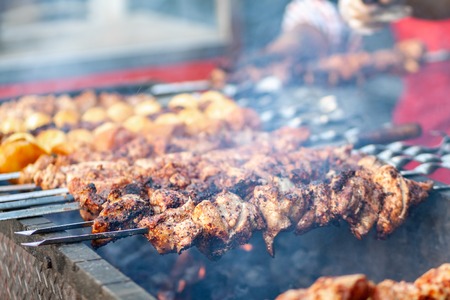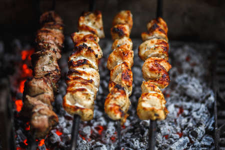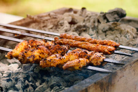 Close up. Grilled chicken meat shish kebab on skewers outdoor.