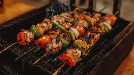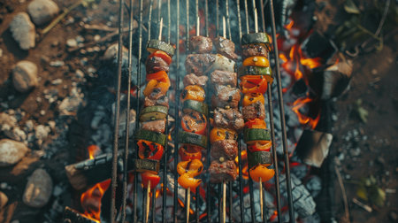 Vibrant grilled skewers featuring colorful vegetables and succulent meat over a charcoal fire, exuding delicious aromas and a summer vibe perfect for outdoor gatherings.