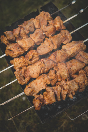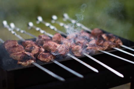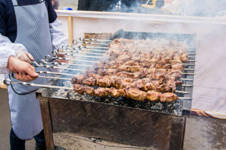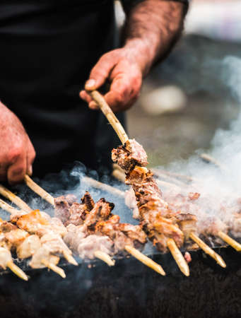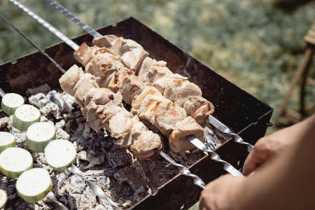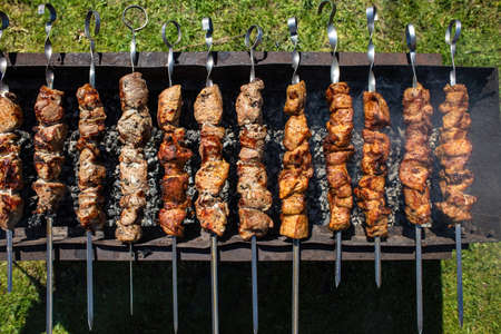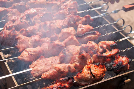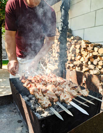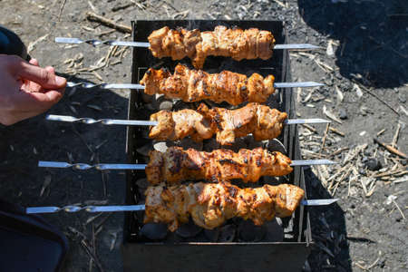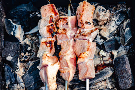 Cooking marinated pork kebabs on the grill. Fried pork kebabs on an open fire. Grill cooking season.