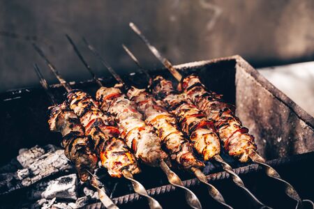 Juicy slices of meat prepare on fire, shish chicken kebab. Kebabs on skewers roasted on the grill outdoors. The skewers on the grill top view