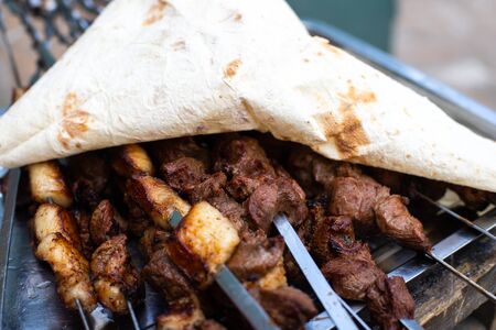 Roasted meat. Appetizing cuts of meat on skewers. Grilled lamb, very tasty food. Kebab background.