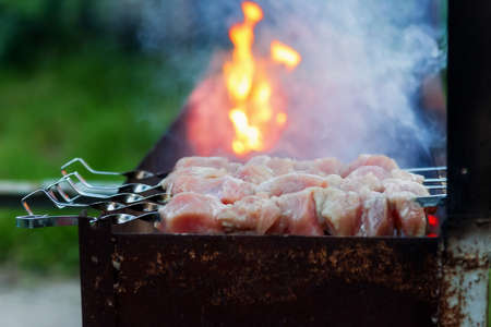 Chicken skewers on skewers on fire. Cooking meat outdoors in the open air.