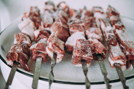 Street fast food festival. Cooking raw kebab closeup. BBQ fresh beef chop slices. Traditional eastern dish, shish kebab. Grill on charcoal and flame, picnic.