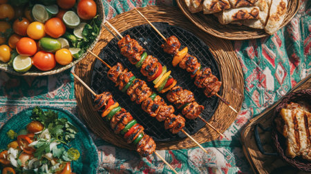 A vibrant outdoor picnic setting with a barbecue grill, showcasing skewers of marinated meats and colorful vegetables ready to be cooked.