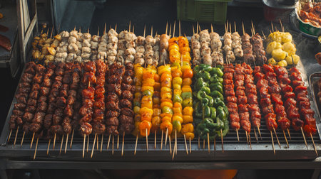 A vibrant display of assorted skewered meat and vegetables showcases a popular street food option. Perfect for any outdoor event or market setting.