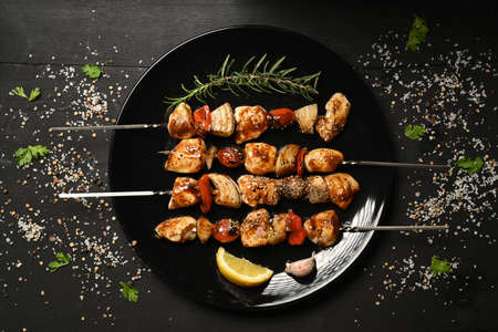 Tasty meat skewers with cherry tomato, sweet pepper and onions on black rustic wooden table. Top view with copy space.
