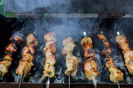 Close-up of pieces of fried meat on a skewer. Delicious, juicy, chicken and pork kebabs are grilled on skewers. On sunny day, outdoor recreation with barbecue. Smoke rises above the barbecue.
