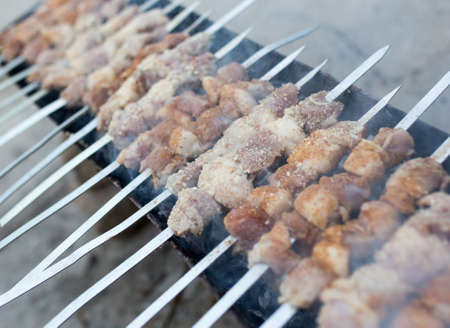 Shish kebab. Pork or lamb meat pieces being fried on a charcoal grill.