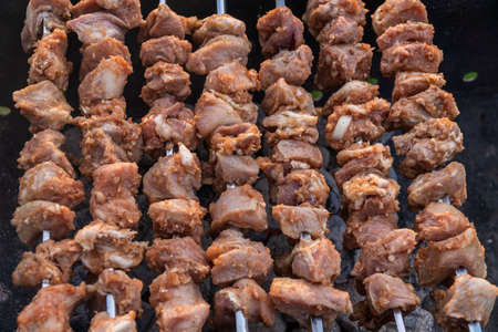 The process of cooking shish kebab on a metal grill in the open air.Grilling shashlik on barbecue grill. Marinated meat.