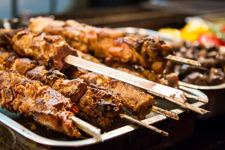 Meat skewers grilled on food market. Selective focus