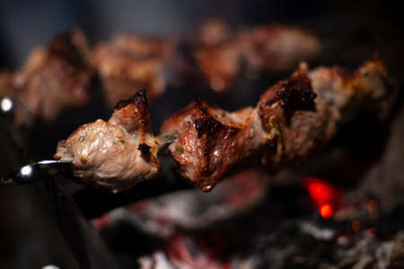 The meat is fried over an open fire. Skewers set on skewers are cooked on a mongal. National cuisine of the Caucasian peoples. Delicious meat gives juice from high temperature. Cooking at night on the street.