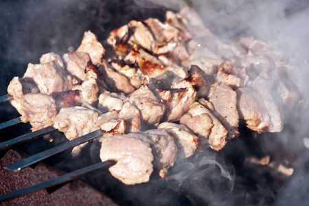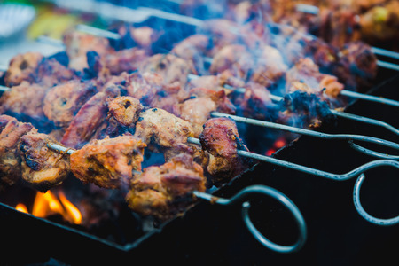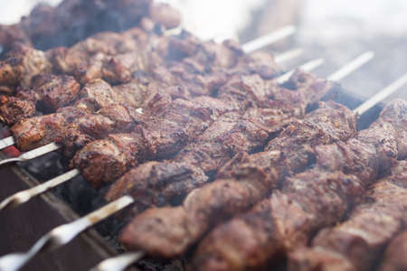 BBQ barbecuing skewers pork kebab, close up image. High quality photo.