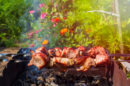 barbecue cooked on coals, under the rays of the summer sun
