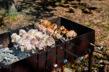 Shish kebab is fried on skewers. Summer rest.