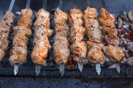 Juicy slices of meat prepare on fire, shish chicken kebab. Kebabs on skewers roasted on the grill outdoors. The skewers on the grill top view