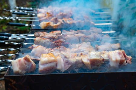 Cooking marinated pork kebabs on the grill. Fried pork kebabs on an open fire. Grill cooking season.