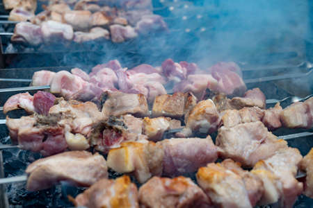 Browned toasted skewers pork meat on a charcoal grill. Smoke in the photo. Close-up. Cooking at the stake in nature.