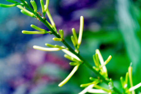 Blurred green abstract floral background of natural twigs of tropical plants with tiny leaves, reminiscent of asparagus or algae