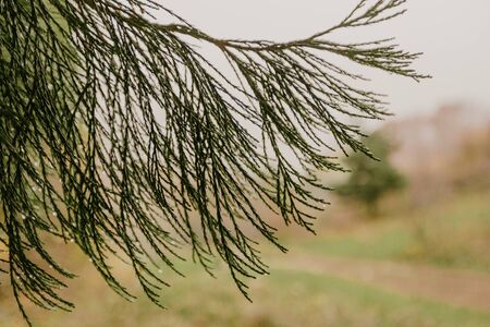 Green branches of a cypress tree on a background of brown tree bark. Forest landscape.