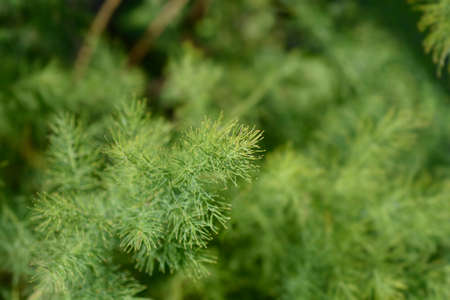 Green plant asparagus brachyphullus in the garden. Macro photo of Dwarf Asparagus with dew drops. High resolution photo. Selective focus. Shallow depth of field.