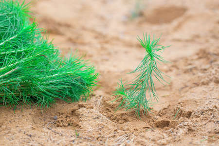 A small tree sapling grows on sandy soil. a bunch of green seedlings lies nearby. Selective focus on a young sprout. The concept of reforestation after deforestation and landscaping of dry lands.