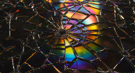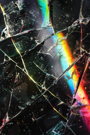 A macro shot of a broken glass surface, showing intricate cracks and vibrant rainbow-like light refractions.