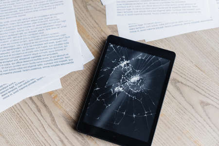 Top view of smashed digital tablet with documents on textured wooden background