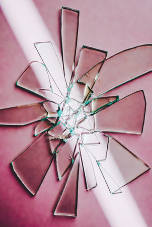 Artistic overhead view of broken mirror or glass shattered into sharp fragments arranged in a radial starburst pattern on a soft pink surface. The shattered pieces reflect light creating an abstract composition with transparent and reflective elements. Perfect for conceptual themes of breaking, destruction, fragility, broken relationships, accidents, bad luck, superstition, or metaphors about shattered dreams, broken identity, and transformation. Ideal for editorial, creative, and psychological concept projects.