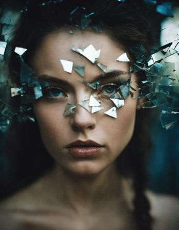 Reflection of broken dreams with shattered mirrors revealing hidden emotions and thoughts of a young woman