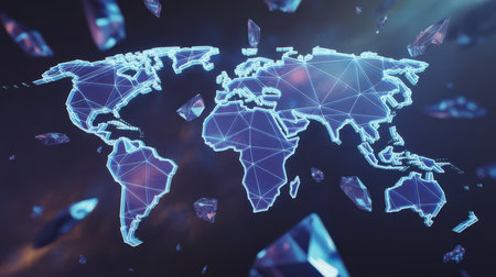 A digital wireframe world map is depicted against a dark background, surrounded by floating, glowing geometric crystal shards in shades of blue and purple. Clear details and vibrant colors enhance ...