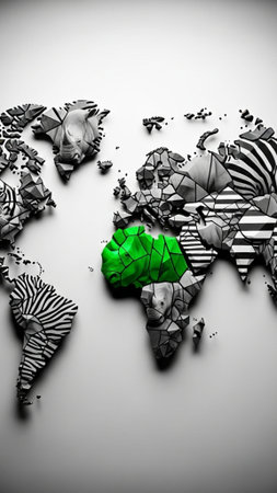 High-contrast conceptual world map mosaic made from geometric animal patterns (stripes, scales). Monochromatic with a bright green accent for hope.