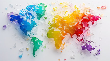 A closeup of shattered glass globe, showcasing continents and fragments of glass. image evokes sense of fragility and impact of change on our planet