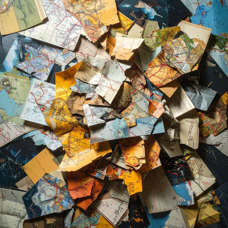 A chaotic yet beautiful collage of torn map pieces creates a dynamic background.