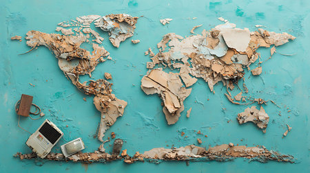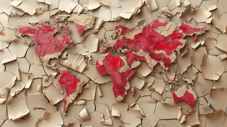 An artistic representation of a cracked wall that reveals a colorful map of the Earth, showcasing continents and oceans with a dark background for dramatic effect.