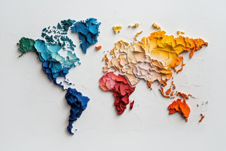 A creative representation of the world map formed from textured cut paper, highlighting continents in bright colors against a plain white backdrop, inviting exploration and imagination.
