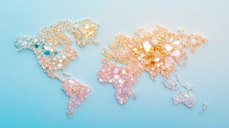 A world map is skillfully formed using various precious gems, highlighted by bright colors and textures that create a stunning visual effect, blending art with geographical representation.