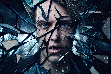 person, in the midst of a raging and schizophrenic episode, surrounded by shattered glass, created with generative ai