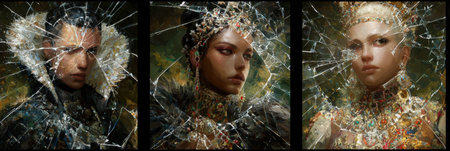 Reflection of broken dreams with shattered mirrors revealing hidden emotions and thoughts of a young woman